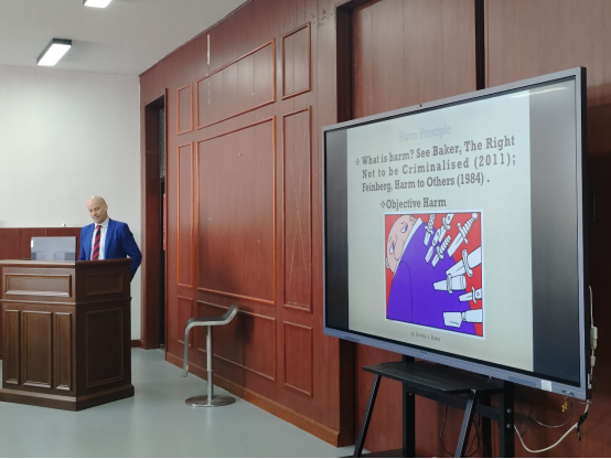 为了更好推进卓越法治人才培养计划,促进以“育人”为核心的人才培养决策部署,以新文科建设为引领,探索涉外法治人才培养方案,提升应用型、复合型法律人才培养质量,国产色情 法律人大讲堂第九十五讲于10月13日在逸夫教学楼2403教室顺利举行。本次讲座嘉宾英国莱斯特德蒙福特大学国产色情 研究教授丹尼斯·贝克(Dennis J. Baker) 以“不被犯罪化的权利--刑法规制的界限”为题作了一场精彩纷呈的学术报告。讲座由国产色情 刑法学硕士研究生导师方也媛副教授主持,国产色情 部分教师、硕士研究生参加了报告会。