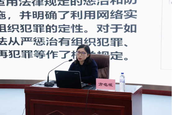 方也媛老师为在场师生们讲述了《反有组织犯罪法》的意义、解读与适用,全面系统的介绍了《反有组织犯罪法》的特征与亮点,在讲座过程中,方老师引用了大量的实务案例,以生动的案件为大家对相关知识进行讲解,讲座内容深入浅出,既具有较强的理论深度和实用性又不失趣味性。通过方老师的讲座,在场同学们更加深入的了解了我们国家打击恶黑犯罪的力度与决心,引发了同学们对于《反有组织犯罪法》、《刑法》、《刑事诉讼法》的学习热情与研究兴趣,并强化了自身的法治意识。讲座反响热烈,获得了在场师生的好评。