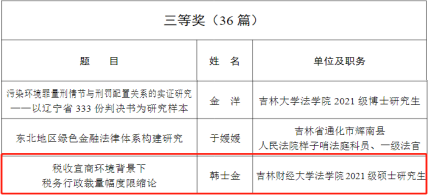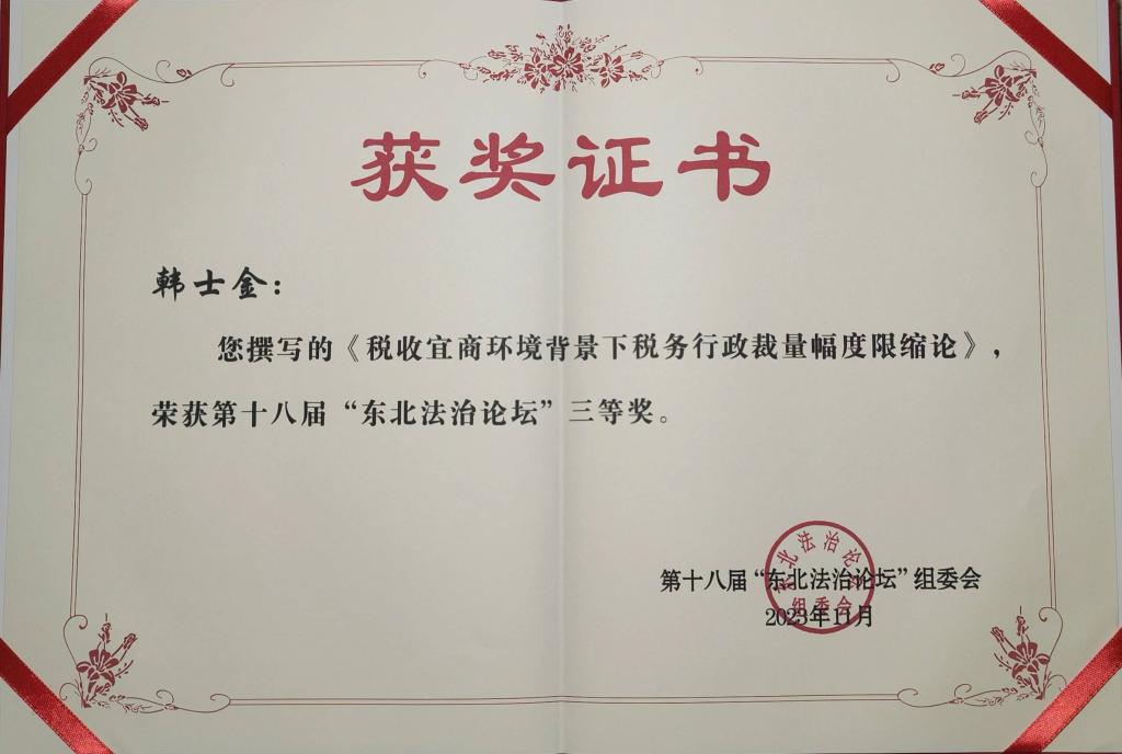近日,从“东北法治论坛组委会”获悉,国产色情 教师吕楠楠博士指导的2021级经济法学硕士研究生韩士金同学撰写的《税收宜商环境背景下税务行政裁量幅度限缩论》一文荣获第十八届“东北法治论坛”论文三等奖。