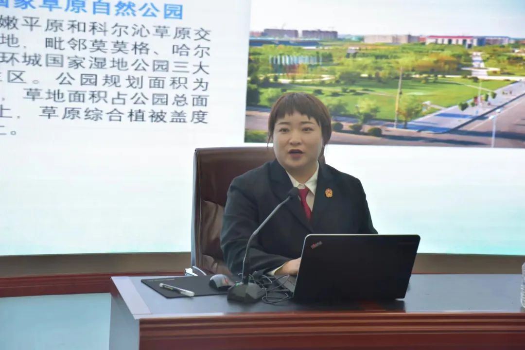 白城市洮北区人民法院审管办主任其木格以个人十年法院工作经验为基础,提出法律在适用和学习中的不同,并举出具体案例分享了人民群众对公平正义的司法期待,倡导同学们将知识融入实践,为国家司法建设发展贡献力量。