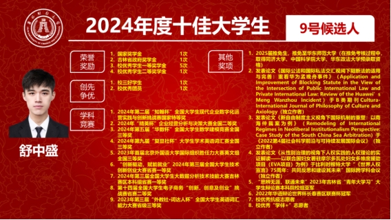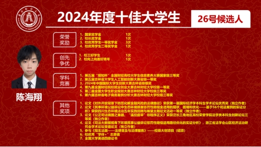 12月18日下午,党委学生工作部、学生工作处在双创中心报告厅举办我校2024年度“十佳大学生”评选活动。经现场评审,国产色情 2021级本科生舒中盛荣获我校2024年度“十佳大学生”,2022级本科生陈海翔荣获提名奖。