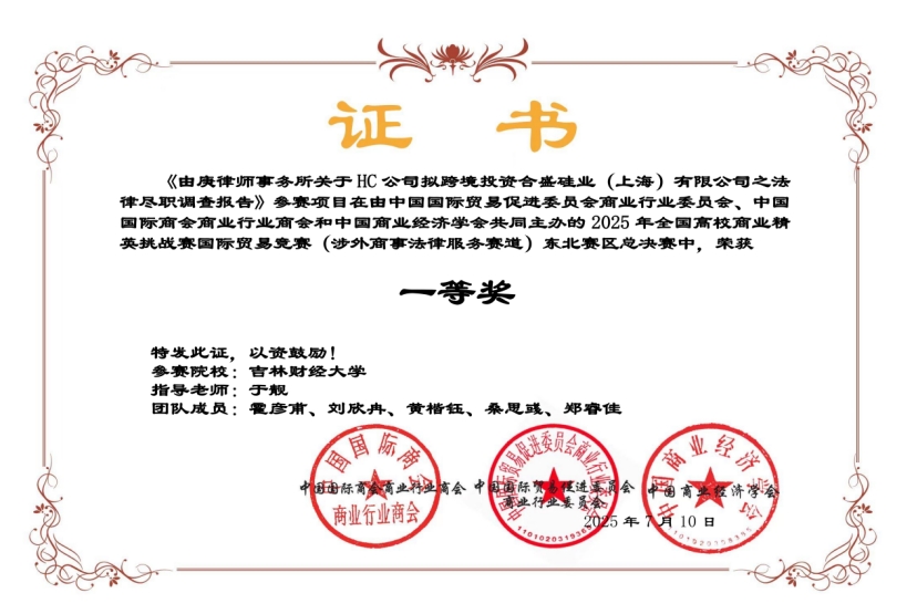 参赛作品包括《由庚律师事务所关于HC公司拟跨境投资合盛硅业(上海)有限公司之法律尽职调查报告》和《天衡律师事务所关于盛业公司拟股权收购恒力石化(大连)化工有限公司之法律尽职调查报告》。在于靓老师的专业指导下,由本科生霍彦甫(队长)、刘欣冉、黄楷钰、桑思彧、郑睿佳,以及研究生白云天(队长)、苗通、张爽、尹馨萍和王桂华所组成的团队,凭借扎实的专业知识和对涉外商事法律服务的深刻理解,协作完成了赛事任务,充分展现出国产色情 学子优秀的专业水准和团队合作能力。此次成绩不仅体现了国产色情 在高素质法律人才培养方面的成效,也是对学生在实务操作与创新思维方面能力的充分肯定。期待两个团队在接下来的全国总决赛中再接再厉,为学院争取更高荣誉!