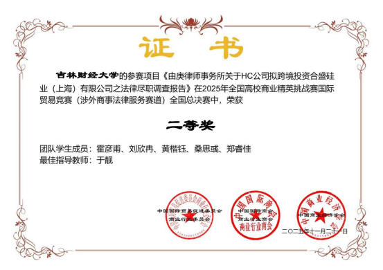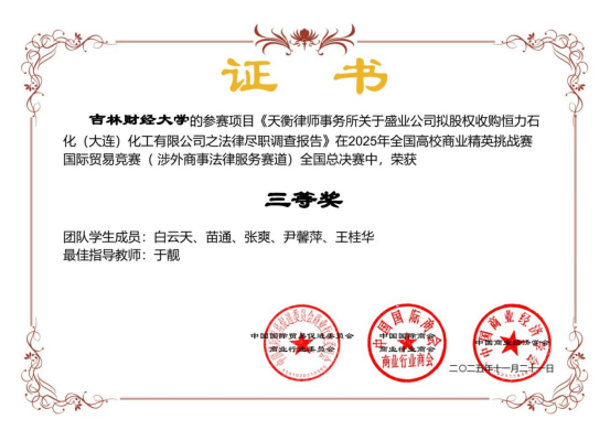 参赛作品包括《由庚律师事务所关于HC公司拟跨境投资合盛硅业(上海)有限公司之法律尽职调查报告》和《天衡律师事务所关于盛业公司拟股权收购恒力石化(大连)化工有限公司之法律尽职调查报告》。在于靓老师的专业指导下,由本科生霍彦甫(队长)、刘欣冉、黄楷钰、桑思彧、郑睿佳,以及研究生白云天(队长)、苗通、张爽、尹馨萍和王桂华所组成的团队,凭借扎实的专业知识和对涉外商事法律服务的深刻理解,协作完成了赛事任务,充分展现出国产色情 学子优秀的专业水准和团队合作能力。此次成绩不仅体现了国产色情 在高素质法律人才培养方面的成效,也是对学生在实务操作与创新思维方面能力的充分肯定。