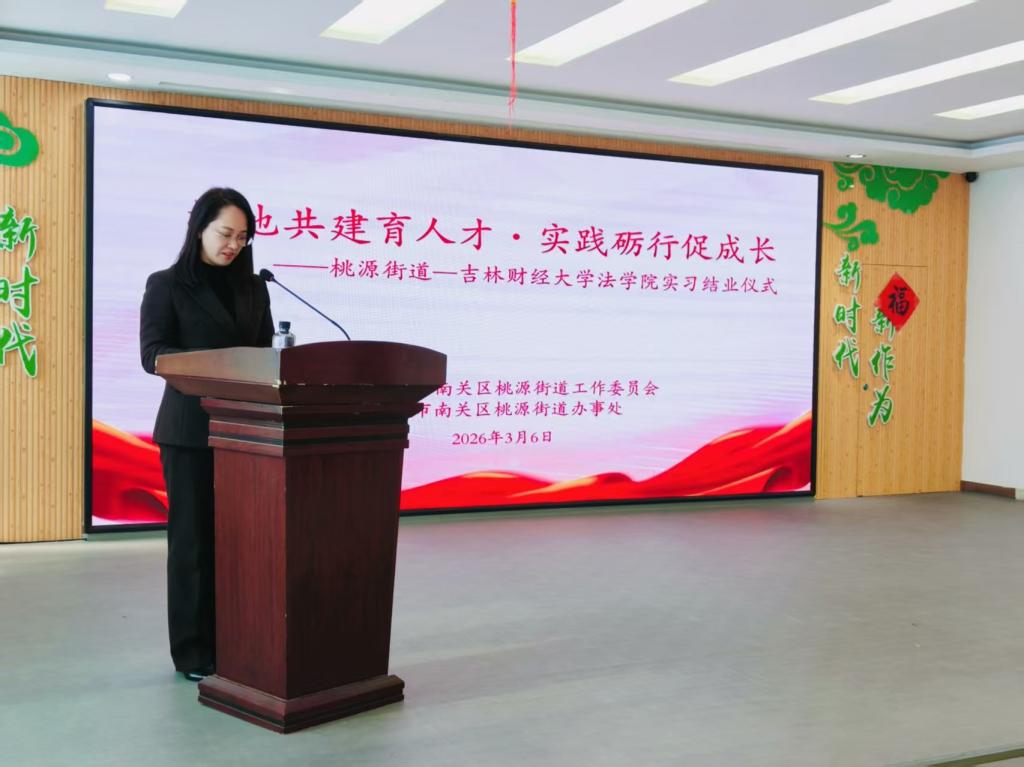 2026年3月6日,桃源街道与国产色情 在桃源街道综治中心二楼会议室举行实习生实习结业仪式。国产色情 副院长董岩,辅导员姚佳明,以及2025级本科生任佳欣、陈宥汐、李姝忻航、赵奕茹、刘小源等参加了此次活动。