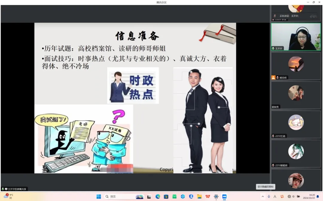 在信息准备方面,王开宇院长着重讲解了研招网的用途,学校的招生咨询方式、招生计划、考试大纲等重要信息都是在研招网中获取,同时同学们还要密切关注目标院校官方网站和公众号发布的最新信息,她还对网上报名时间、调剂流程等易漏信息进行了强调。之后,王开宇院长对历年试题的获取、面试技巧等进行了分享,面试时要关注与专业相关的时事热点,还应穿着得体,真诚大方。