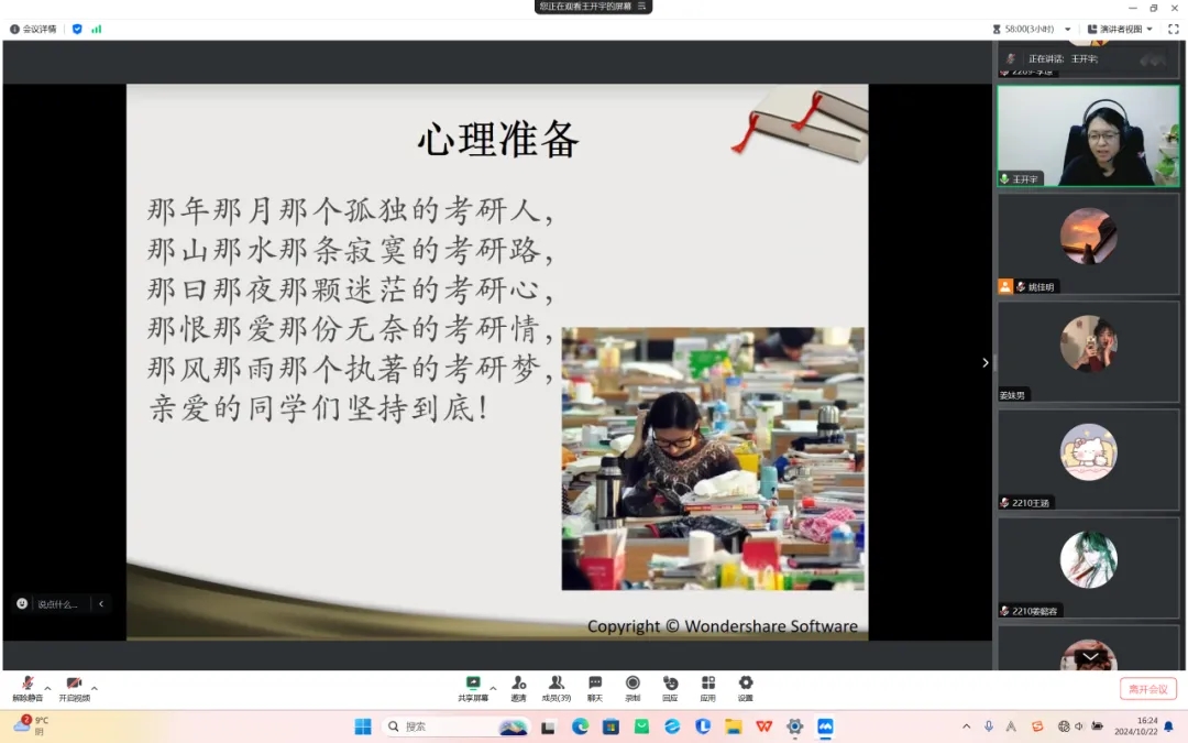 王开宇院长从内容准备、信息准备、心理准备三个方面对研究生考试进行了讲解和指导。
