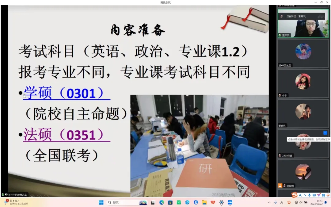 在内容准备方面,王开宇院长对硕士研究生考试科目、学硕和法硕的命题区别、专业课代码等进行了细致的讲述,提醒同学们留意报考学校官网公布的参考教材和招生简章。