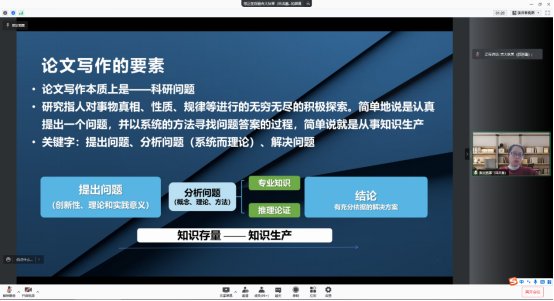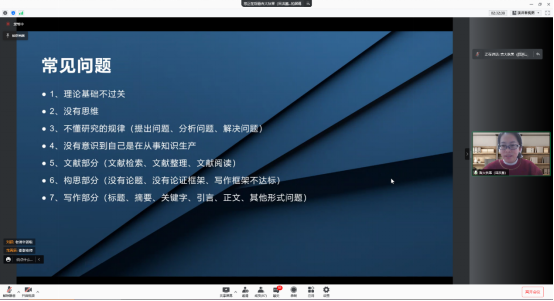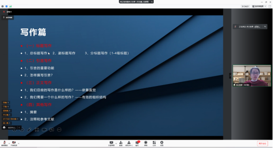 12月9日晚,田洪鋆教授作“论文写作的要素、过程及常见错误”主题讲座,围绕论文写作的要素、论文写作的过程、论文写作的常见问题分别展开。提出论文写作本质上是科研问题,学生应实现从知识到能力的转化;论文应以文献、构思、写作思路进行;在写作过程中,需要夯实基础,规避常见问题。交流环节,田洪鋆教授与学生就提出的问题展开交流,弹幕留言600余条,气氛热烈。