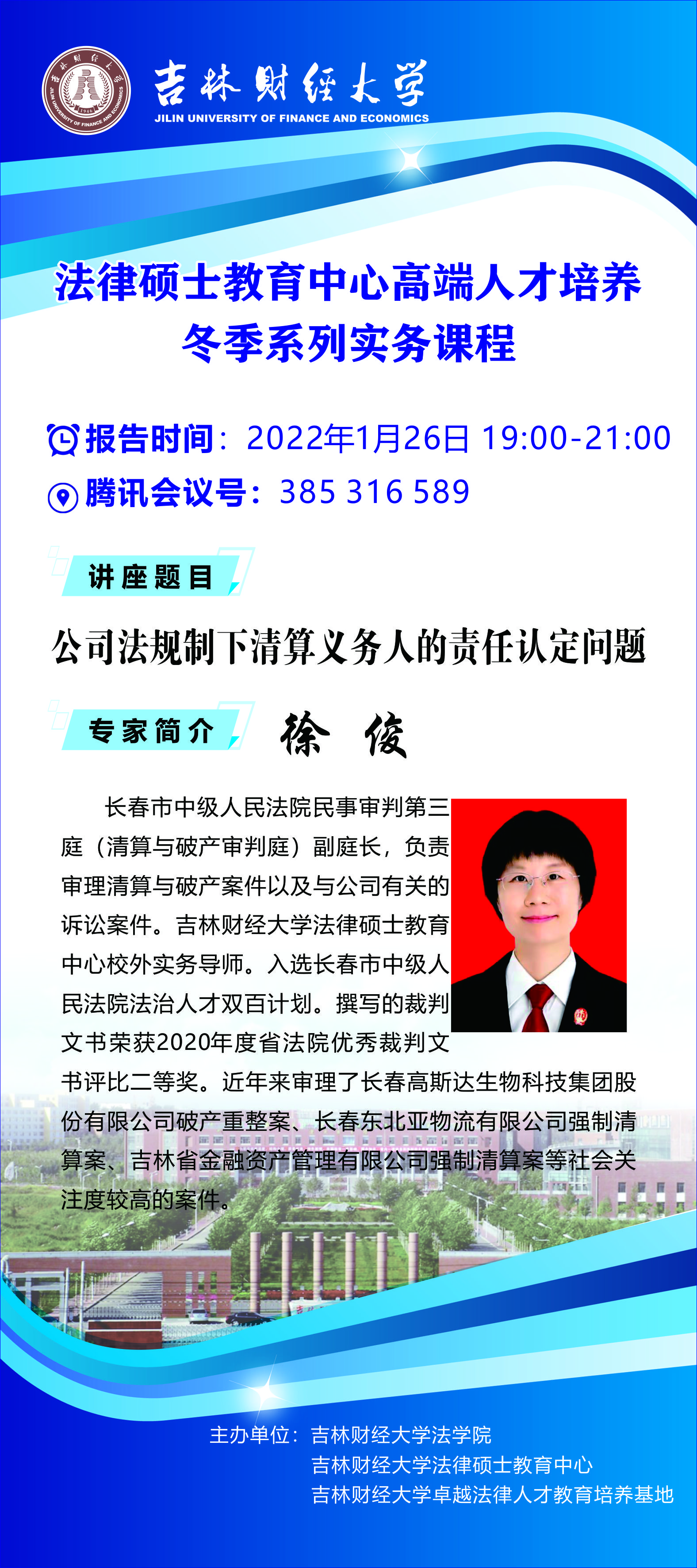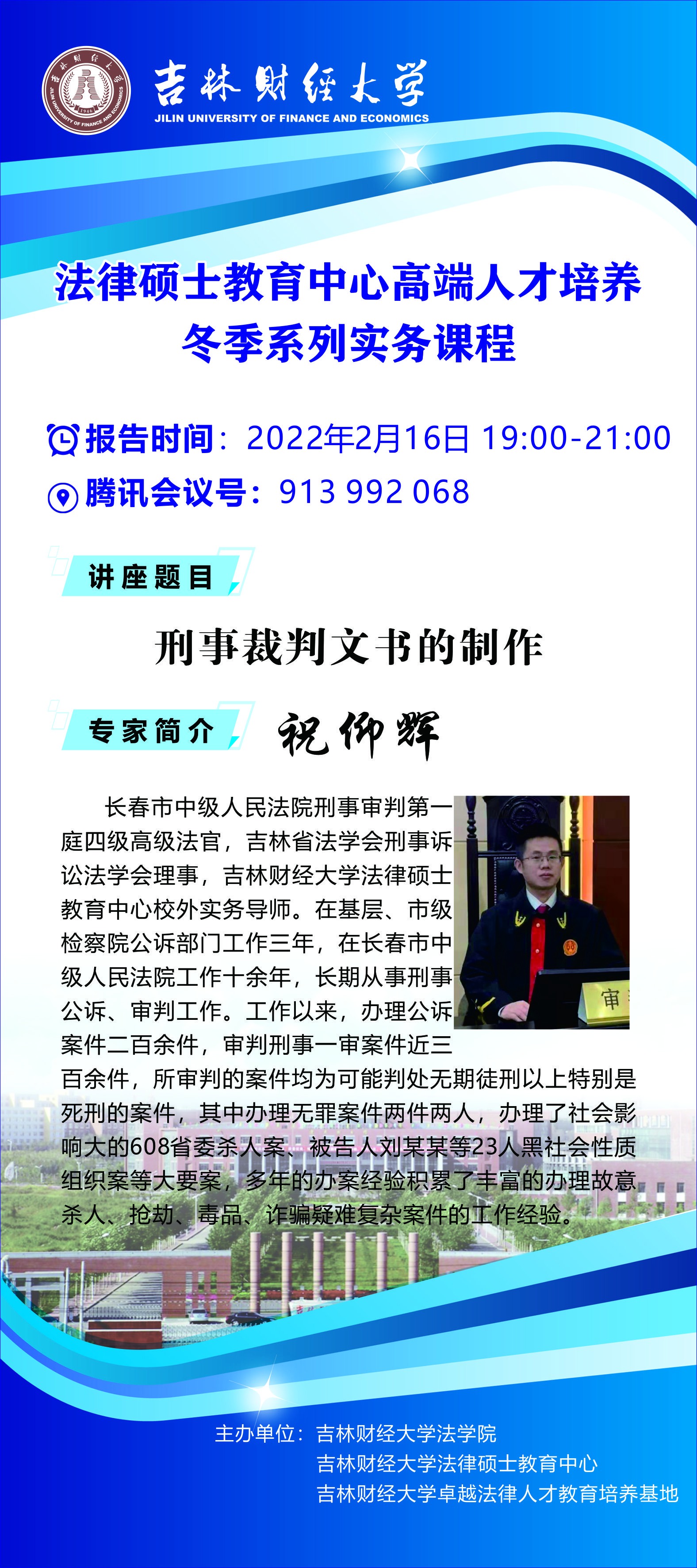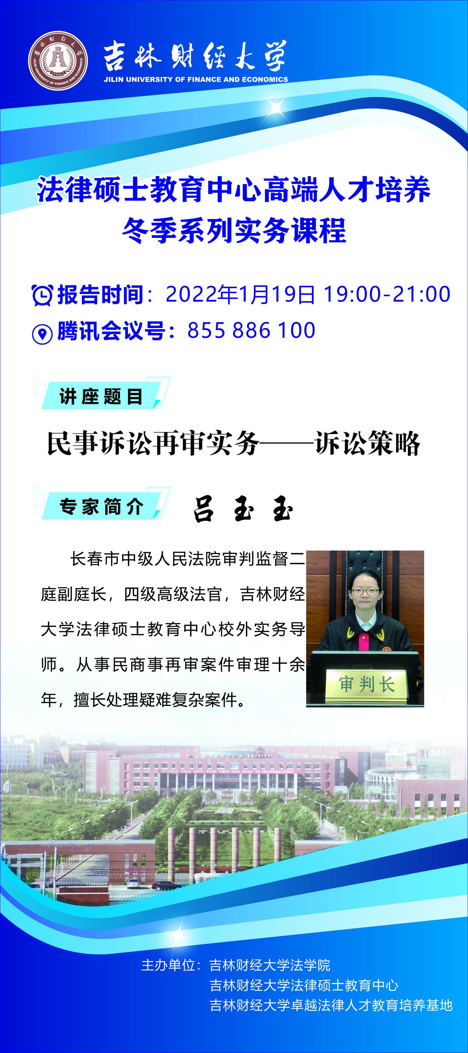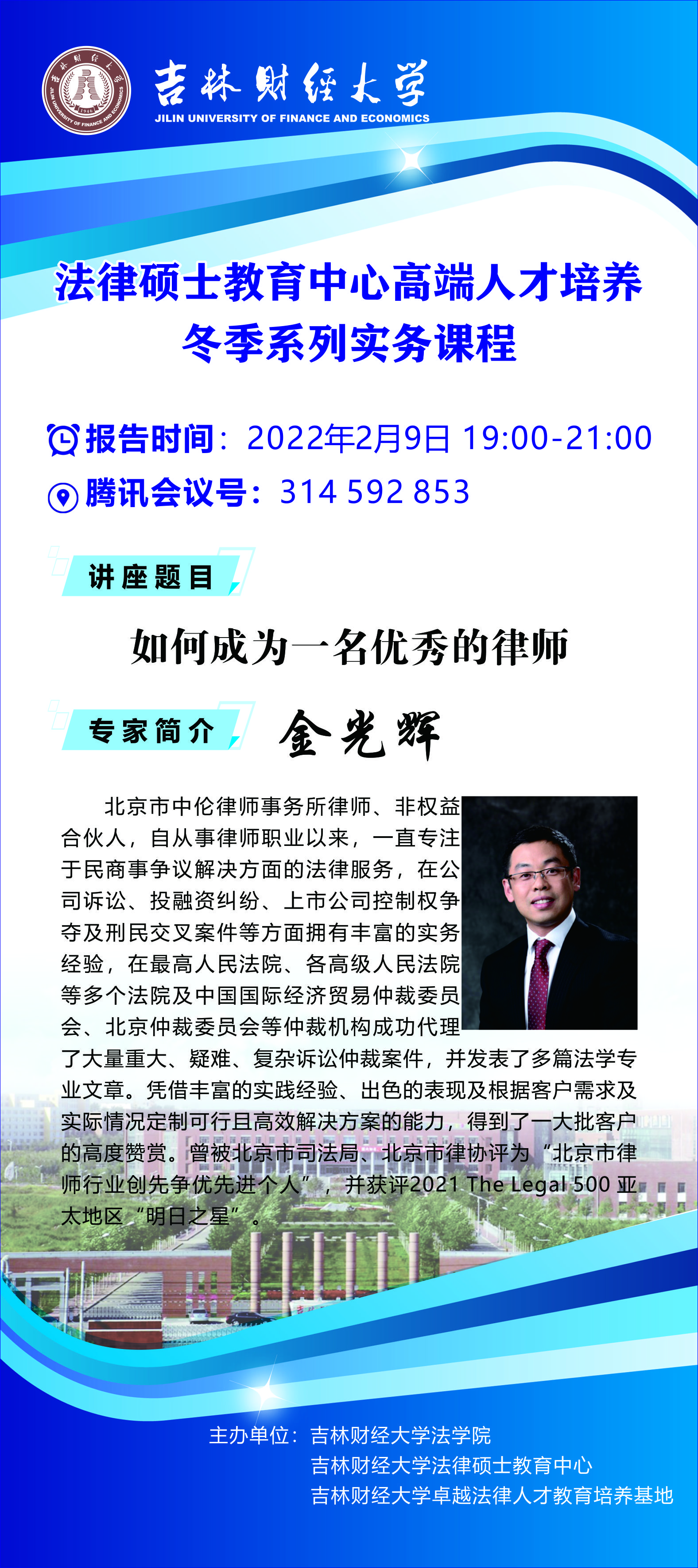 法律硕士教育中心“2022年冬季法律系列实务课程”共设5场,时间跨越6周的寒假生活,每周三晚7点至晚9点,准时相约腾讯会议。开讲在即,敬请关注。
