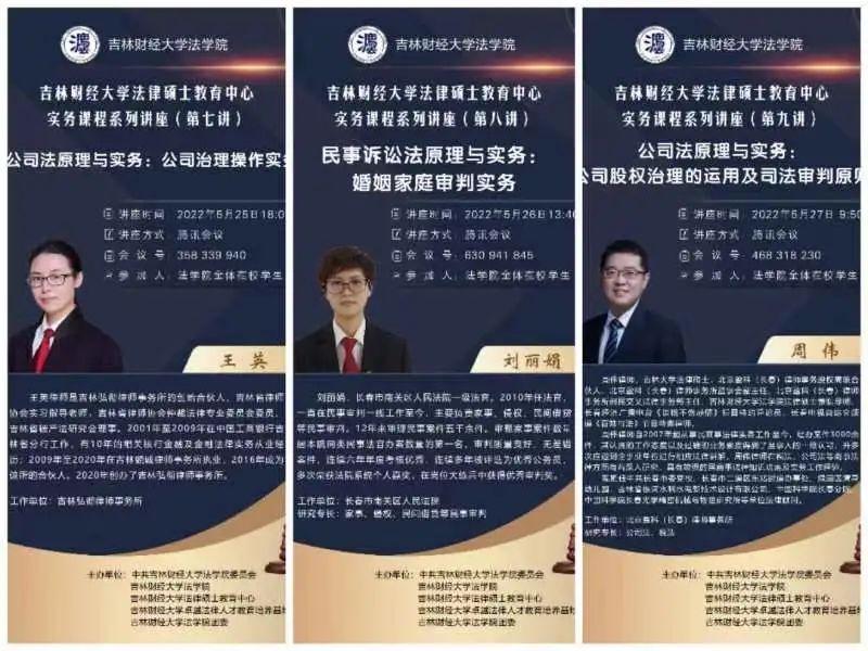 系列讲座阵容豪华、“众星云集”,聘请了来自不同专业领域的实务专家,分别为浩瑞恒泰集团副总经理林森,辽宁省税务局一级巡视员胡彦伟教授,吉林省自然资源厅法规处处长许鹏,吉林省民政厅政策法规处处长马城屹,吉林省人民检察院第八检察部副主任孙莉婷检察官,吉林省高级人民法院民事审判第一庭副庭长杨迪,吉林弘彻律师事务所创始合伙人王英,长春市南关区人民法院一级法官刘丽娟,北京盈科(长春)律师事务所股权高级合伙人周伟律师,上海市汇业(长春)律师事务所高级合伙人刘一鸣,长春市中级人民法院法官訾效云,长春市九台区人民检察院检察官刘易思。讲座吸引了大批国产色情 学生、老师和其他学院的学生、老师以及已经毕业的国产色情 学生和校外感兴趣的同行上线学习、观摩。