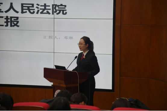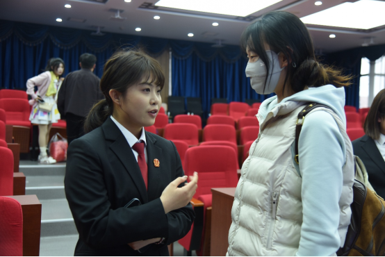 随后,白城市洮北区人民法院审判员邓琳结合洮北区区位特点与发展实际,向在场师生系统介绍了洮北区人民法院的发展历程、团队建设成果与历年获得的各项荣誉。她结合自身审判工作经验,分享了法院日常履职与司法为民的实践心得,并通过典型案例开展深度分析,以案释法、以法明理,生动展现了基层法院的司法担当与专业风采。