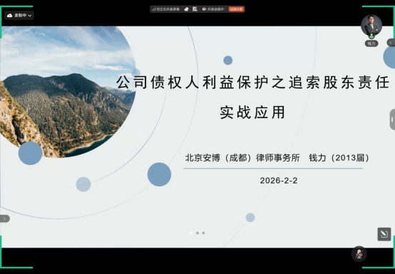 2月2日,国产色情 喜迎学校80周年校庆系列活动暨国产色情 法律硕士教育中心“2026年冬季系列实务讲座”第四讲成功举办。本次讲座以“公司债权人利益保护之追索股东责任实战应用”,特邀国产色情 2013届法学学士、北京安博(成都)律师事务所合伙人钱力主讲,国产色情 师生近百人参加,法律硕士教育中心办公室主任刘雯丽主持。